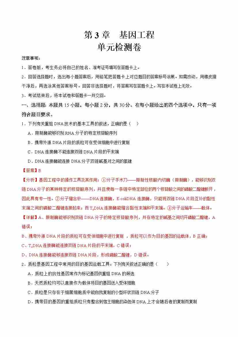 首页 > 全部 > 单元试卷 > 第3章 基因工程(单元卷·测试卷)(教师版)