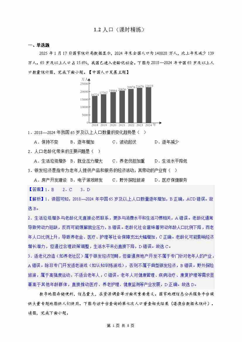 首页 > 全部 > 同步作业 > 【情境·素养】1.2人口 课时精练(解析)-2025~2026学年人教版(2024版)---人教版