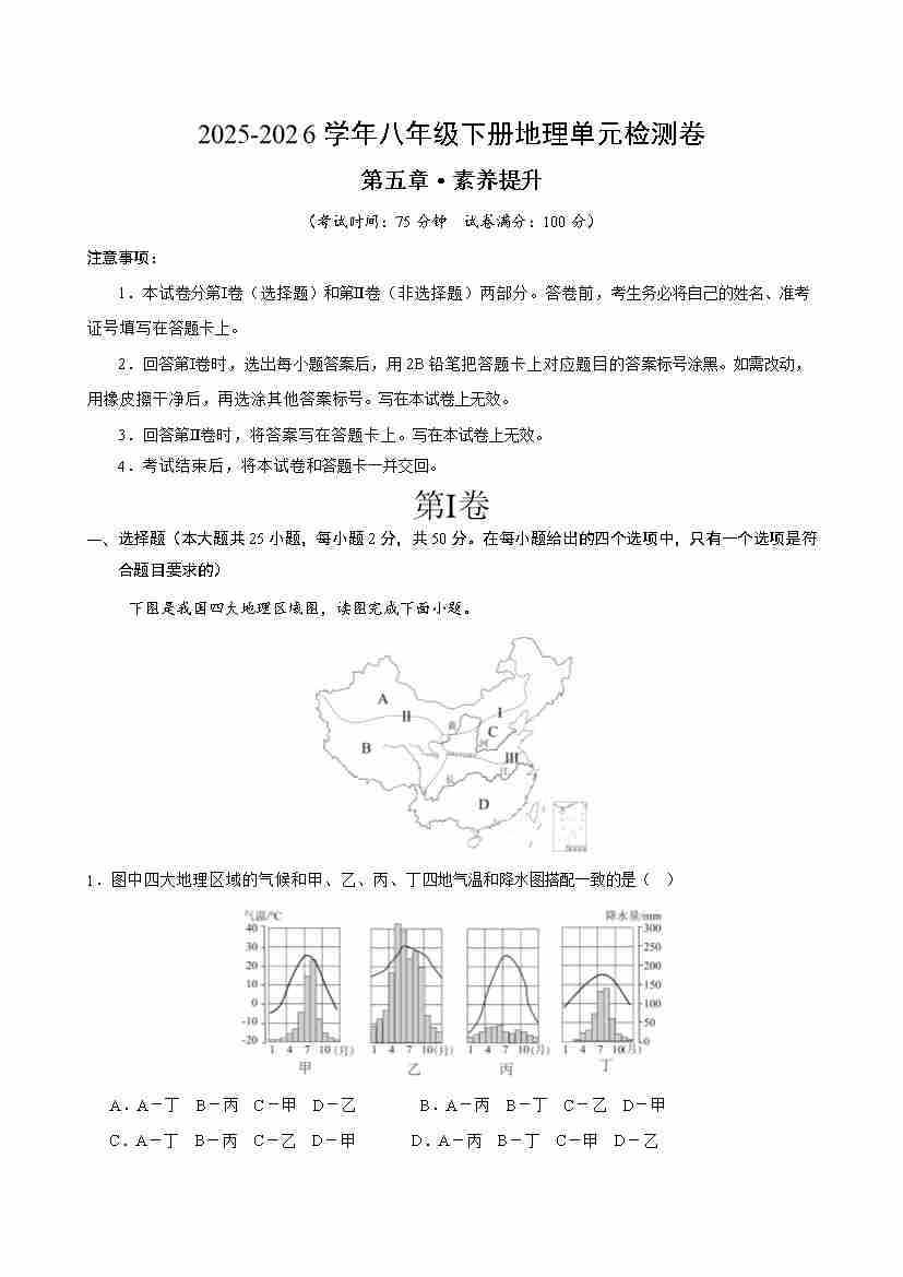 八下地理第五章测试·提升卷(考试版A4)