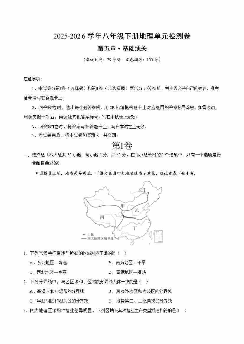 首页 > 全部 > 单元基础卷 > 八下地理第五章测试·基础卷(解析版)