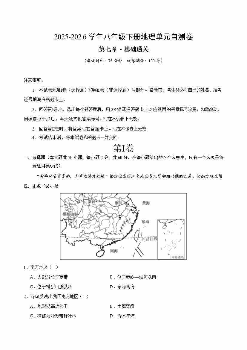首页 > 全部 > 单元基础卷 > 八下地理第七章自测·基础卷(解析版)