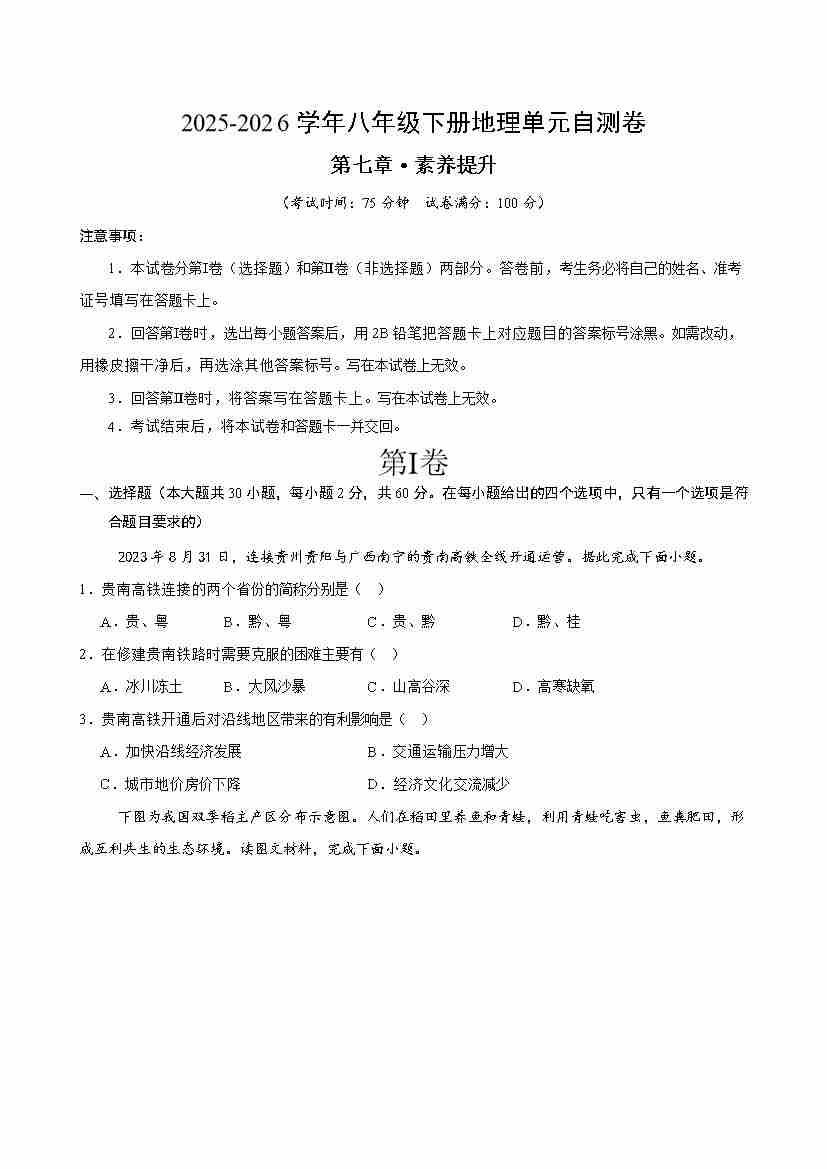 首页 > 全部 > 单元提升卷 > 八下地理第七章自测·提升卷(考试版A4)
