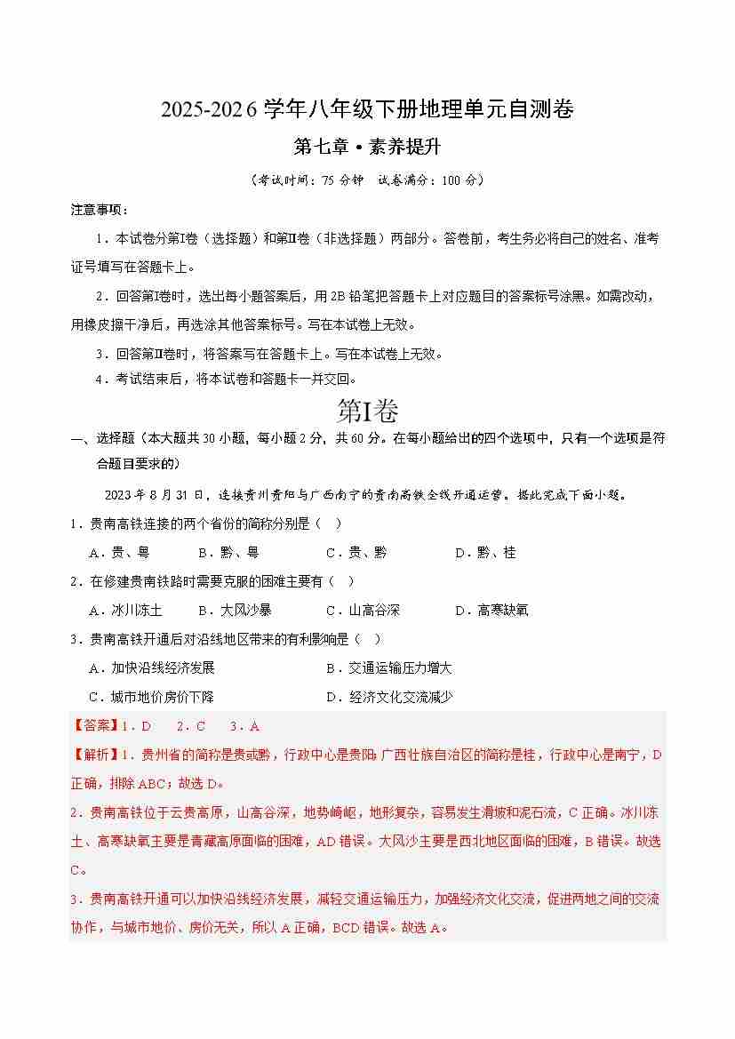 首页 > 全部 > 单元提升卷 > 八下地理第七章自测·提升卷(解析版)