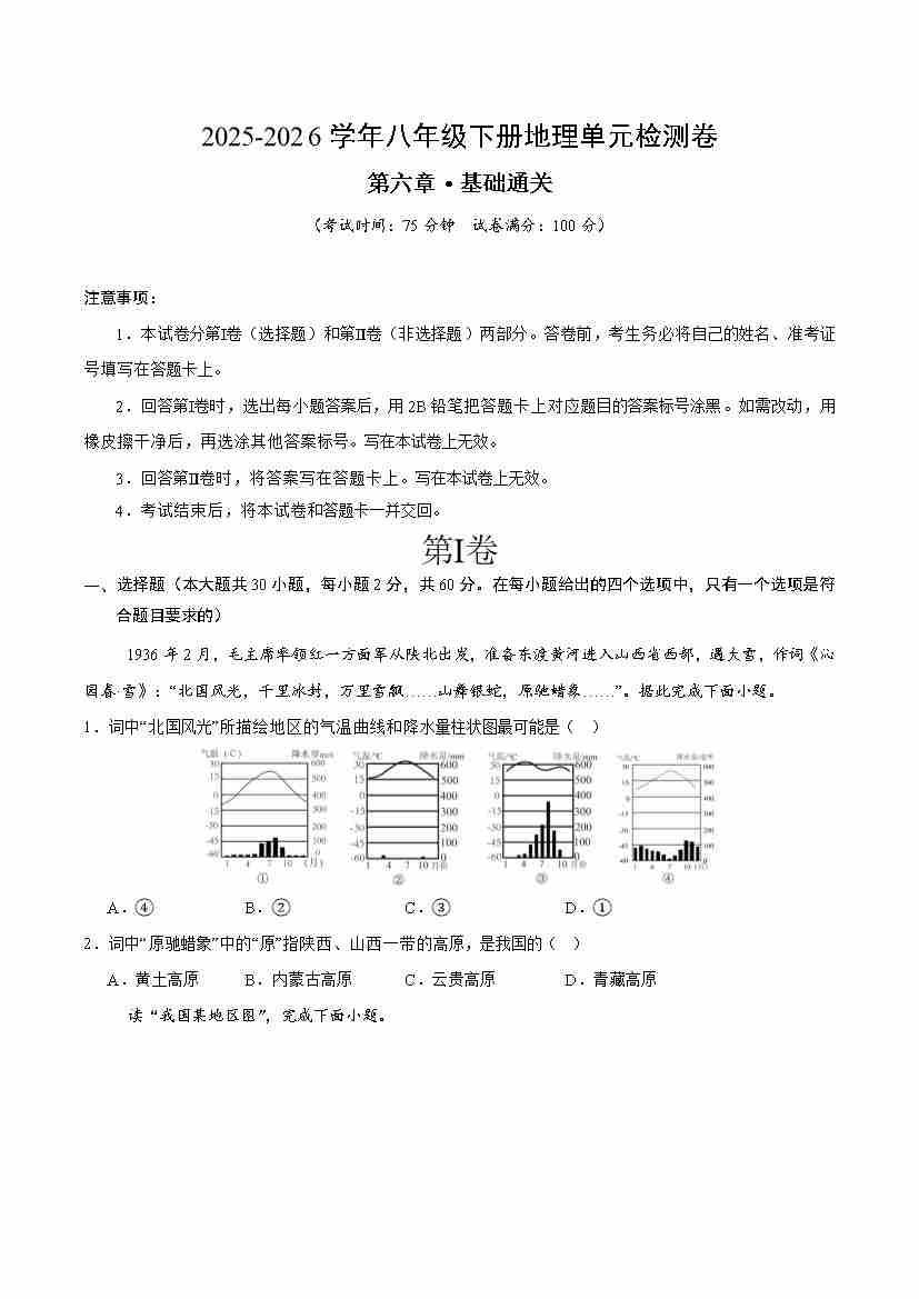 八下地理第六章测试·基础卷(考试版A4)9