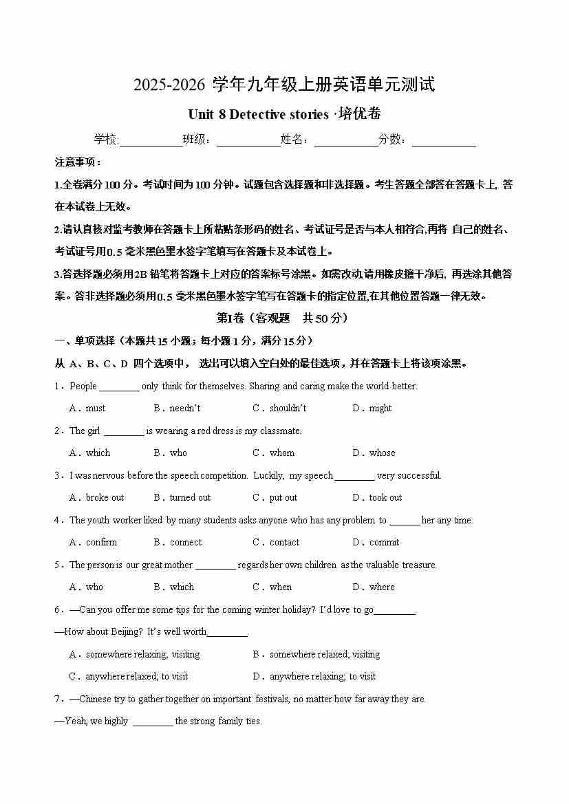 九年级英语上册Unit 8 Detective stories 单元测试·培优卷(学生版)
