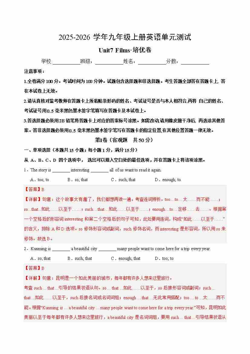 九年级英语上册 Unit 7 Films 单元测试·培优卷(教师版)