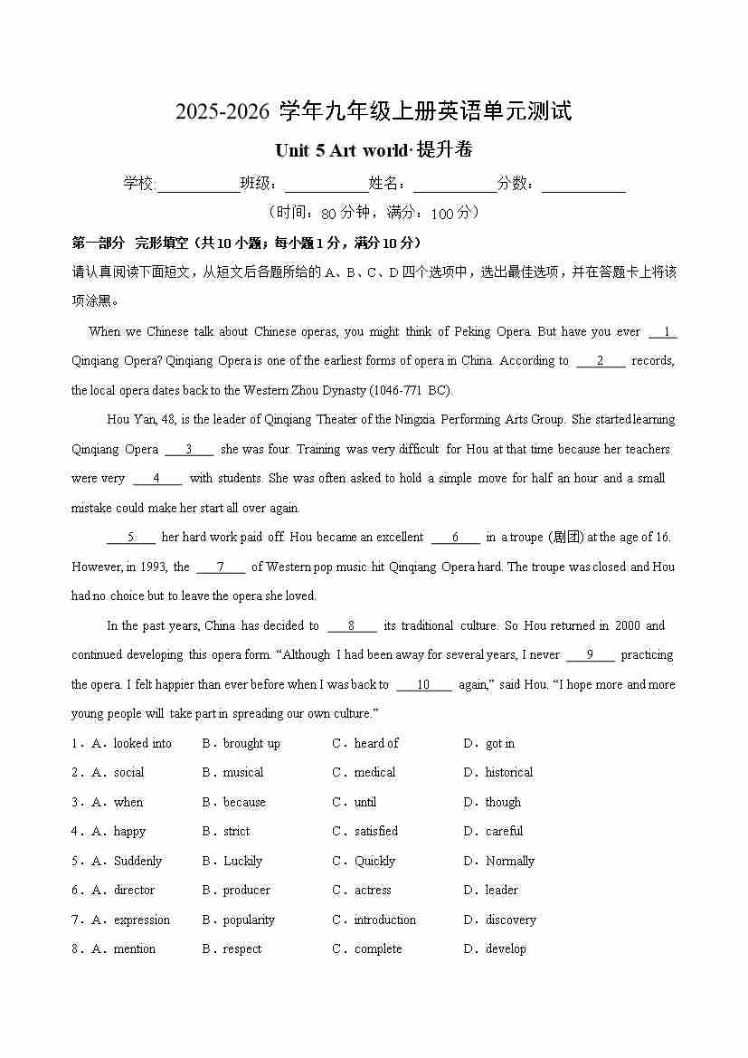 首页 > 全部 > 单元测试 > 九年级英语上册Unit 5 Art world 单元测试·提升卷(教师版)