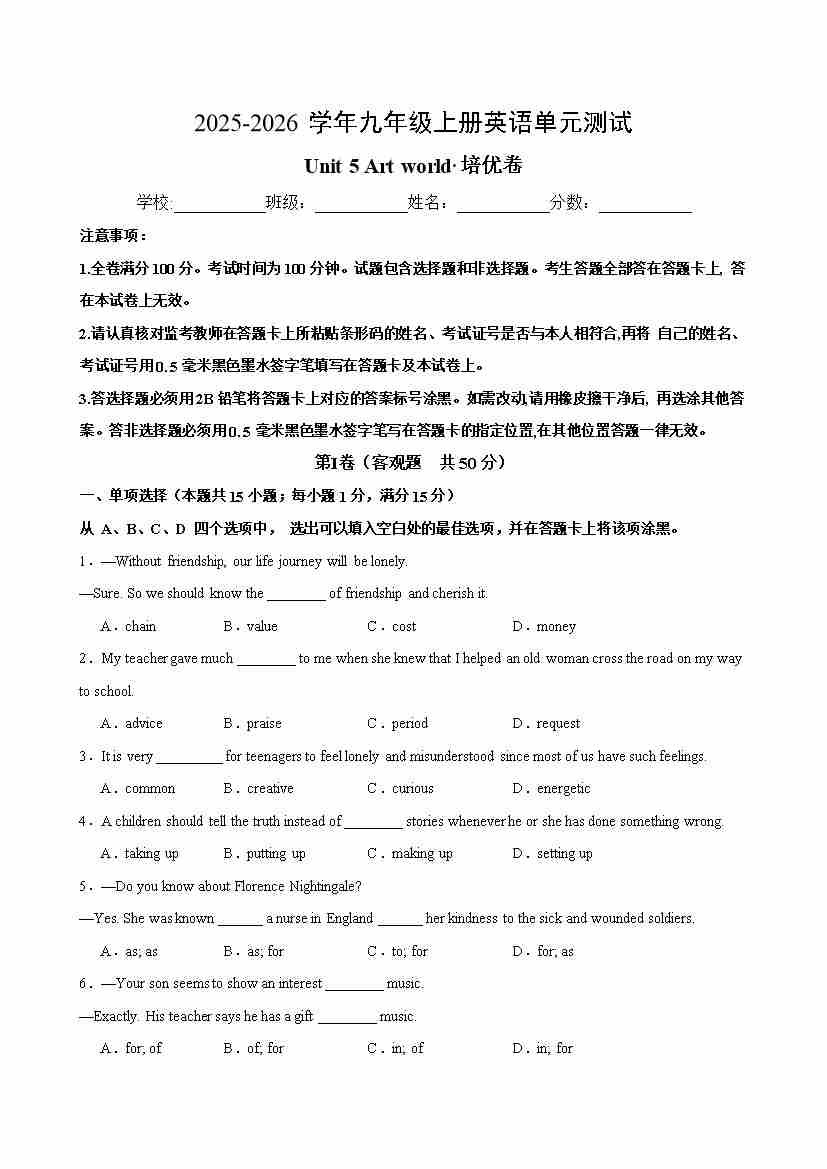 九年级英语上册Unit 5 Art world 单元测试·培优卷(学生版)