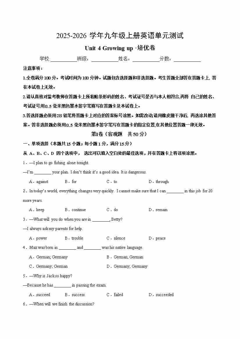 首页 > 全部 > 单元测试 > 九年级英语上册Unit 4 Growing up 单元测试·培优卷(考试版A4)