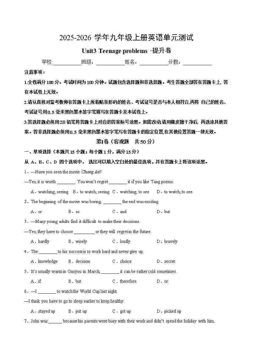 首页 > 全部 > 单元测试 > 九年级英语上册Unit 3 Teenage problems 单元测试·培优卷(考试版A4)