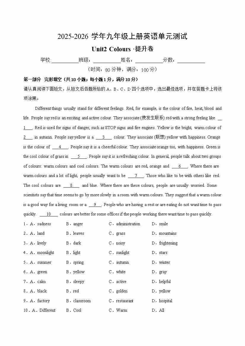 首页 > 全部 > 单元测试 > 九年级英语上册Unit 2 Colours 单元测试·提升卷(考试版A4)