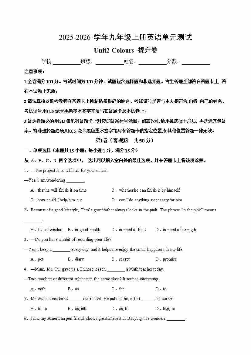 九年级英语上册Unit 2 Colours 单元测试·培优卷(考试版A4)