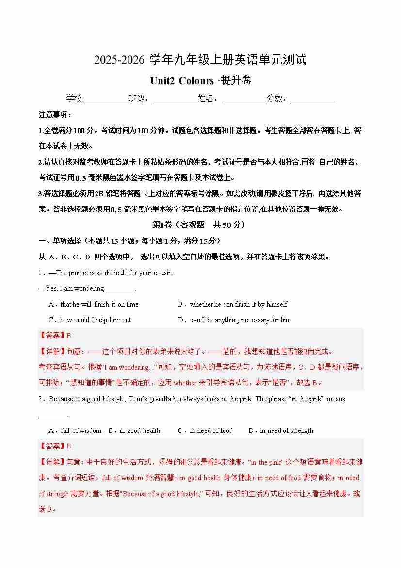 九年级英语上册Unit 2 Colours 单元测试·培优卷(解析版)