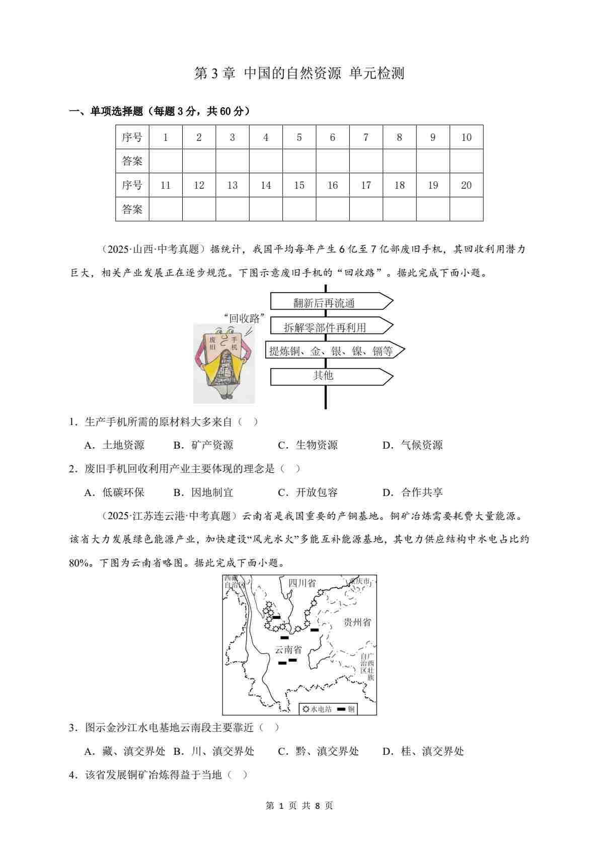首页 > 全部 > 单元检测 > 【情境·素养】第3章 中国的自然资源 单元检测(原卷)-2025~2026学年人教版(2024版)