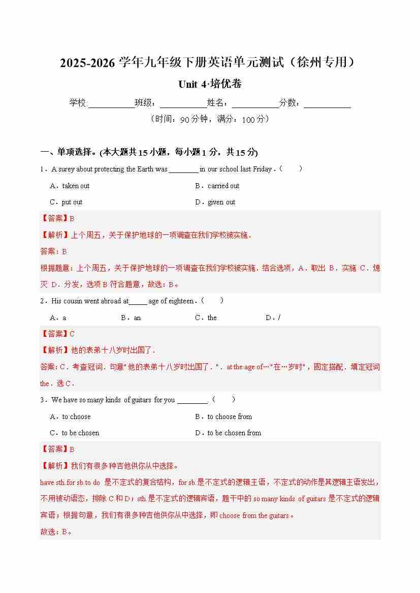 首页 > 全部 > 单元测试 > 九年级英语下册Unit 4 单元测试·徐州专用(解析版)