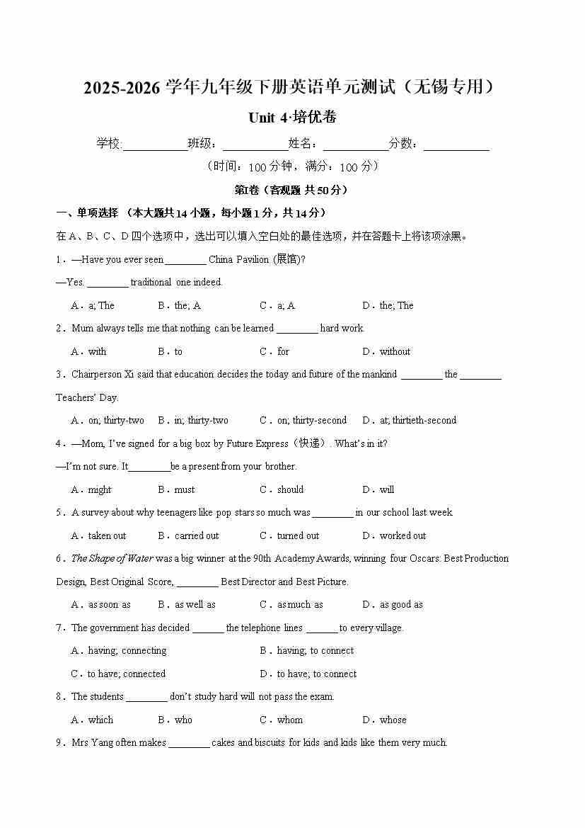 九年级英语下册Unit 4 单元测试·无锡专用(考试版A4)