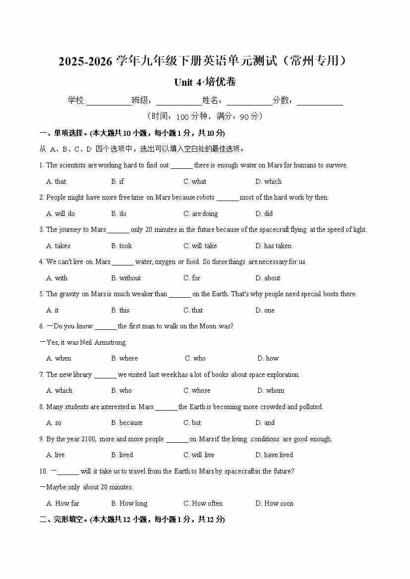 九年级英语下册Unit 4 单元测试·常州专用(考试版A4)