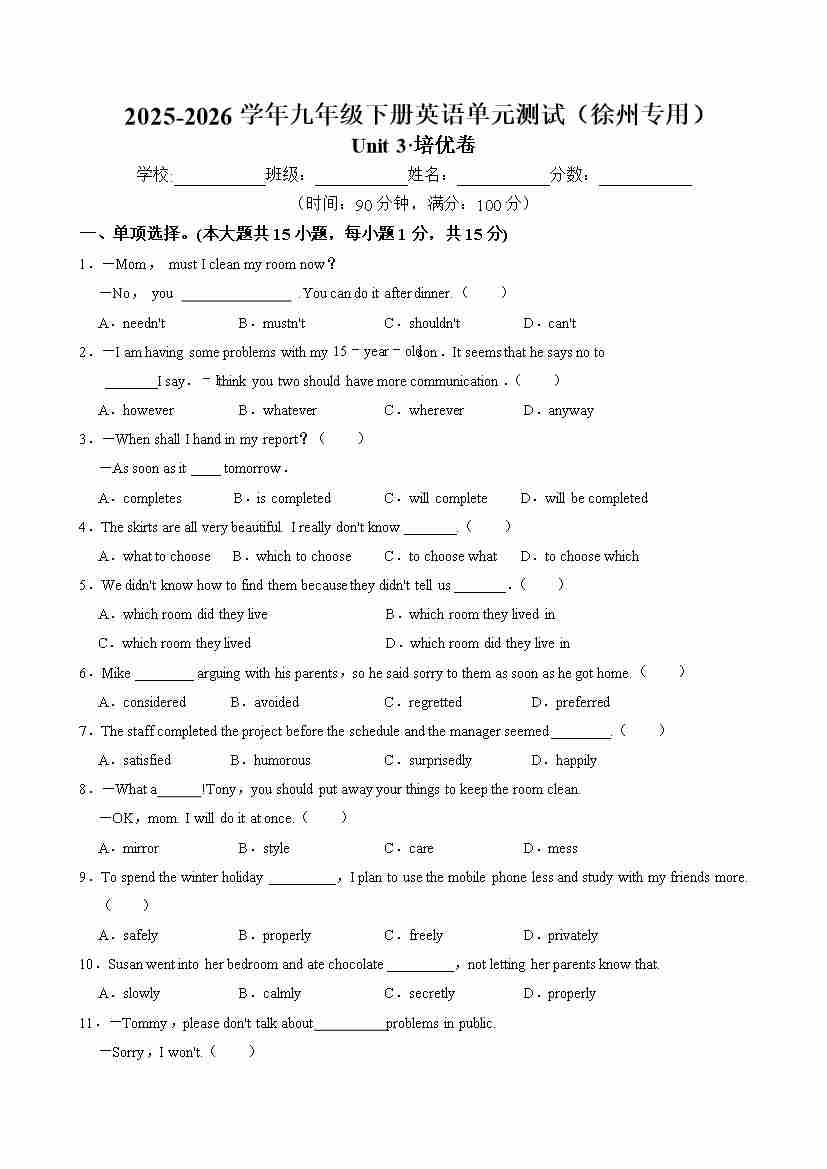 首页 > 全部 > 单元测试 > 九年级英语下册Unit 3 单元测试·徐州专用(原卷版)