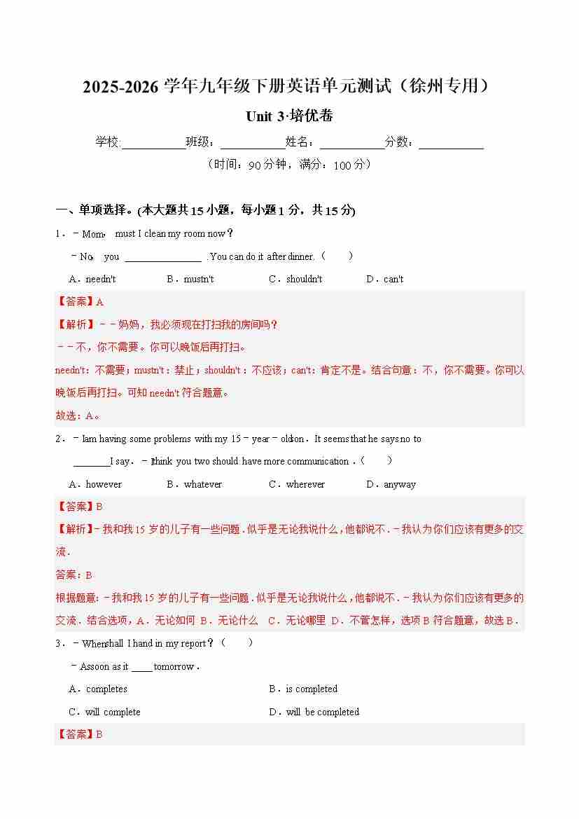 首页 > 全部 > 单元测试 > 九年级英语下册Unit 3 单元测试·徐州专用(解析版)