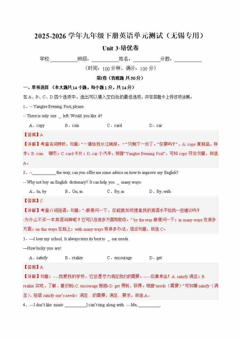 九年级英语下册Unit 3 单元测试·无锡专用(解析版)