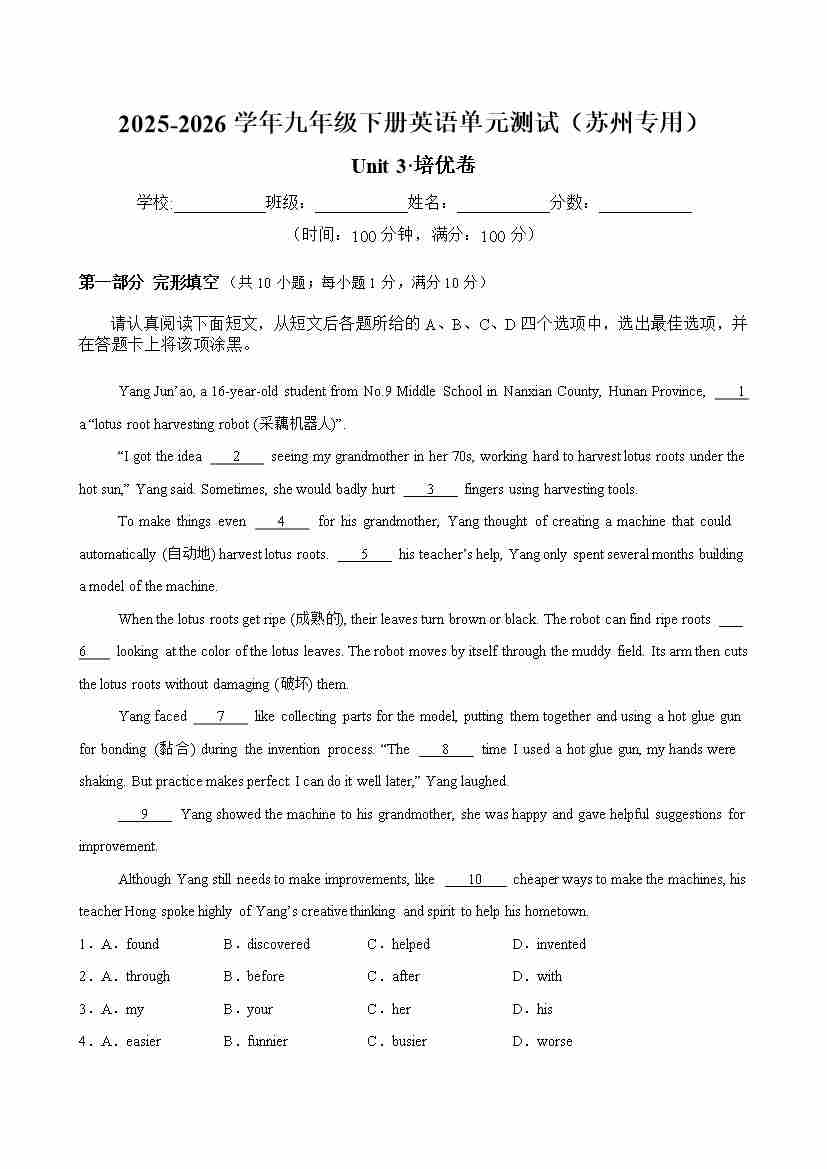 首页 > 全部 > 单元测试 > 九年级英语下册Unit 3 单元测试·苏州专用(解析版)