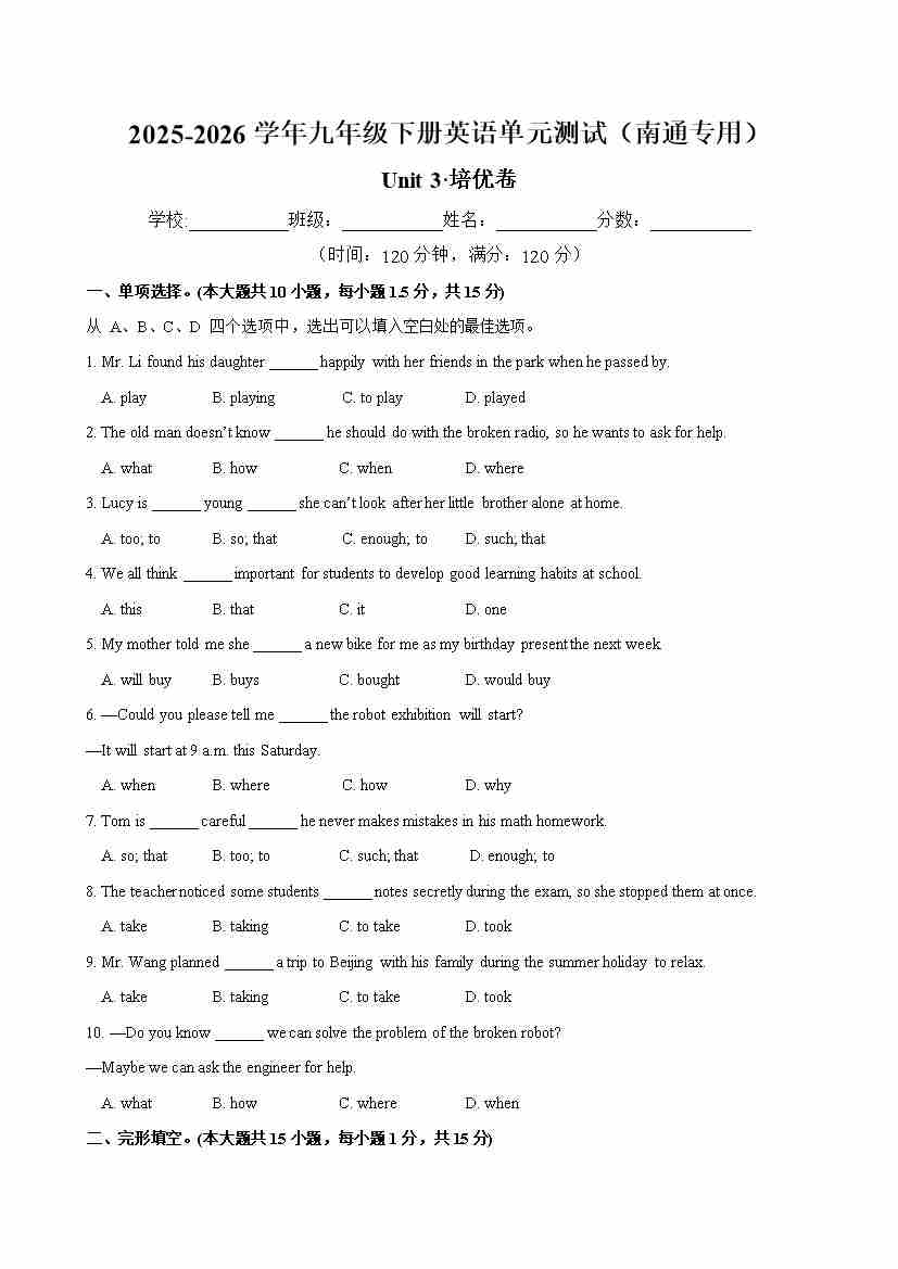 首页 > 全部 > 单元测试 > 九年级英语下册Unit 3 单元测试·南通专用(考试版A4)