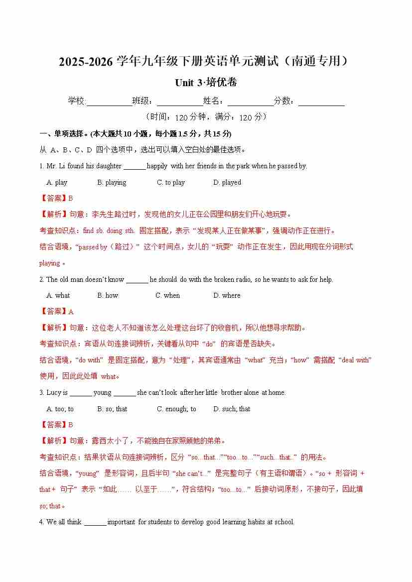 首页 > 全部 > 单元测试 > 九年级英语下册Unit 3 单元测试·南通专用(解析版)