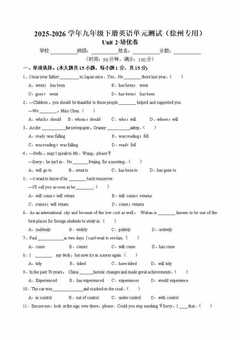首页 > 全部 > 单元测试 > 九年级英语下册Unit 2 单元测试·徐州专用(原卷版)
