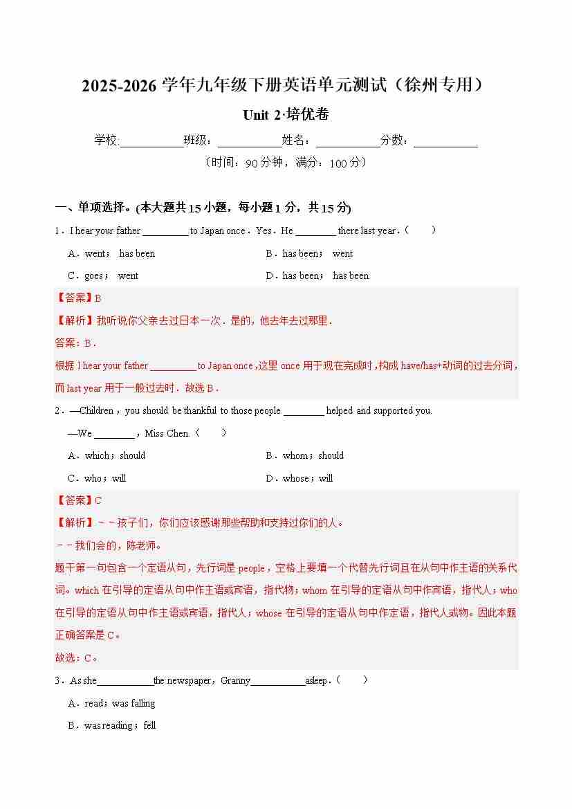 首页 > 全部 > 单元测试 > 九年级英语下册Unit 2 单元测试·徐州专用(解析版)