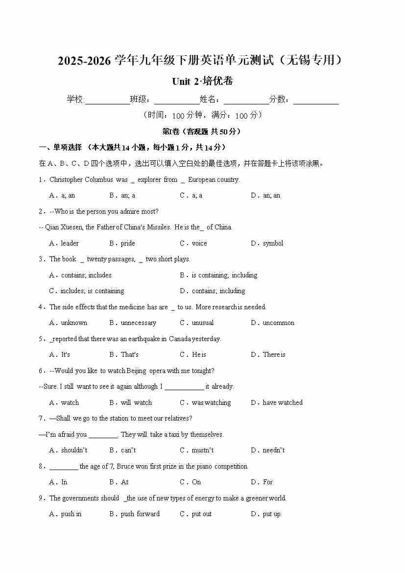 九年级英语下册Unit 2 单元测试·无锡专用(考试版A4)