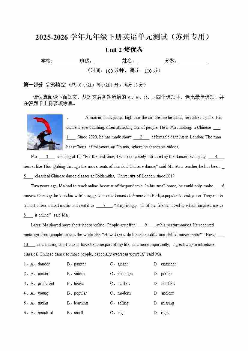 首页 > 全部 > 单元测试 > 九年级英语下册Unit 2 单元测试·苏州专用(解析版)