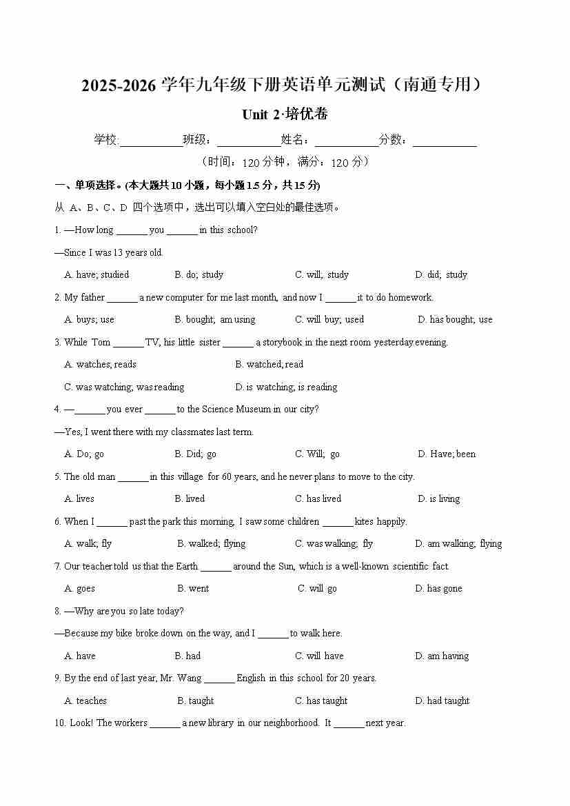 首页 > 全部 > 单元测试 > 九年级英语下册Unit 2 单元测试·南通专用(考试版A4)
