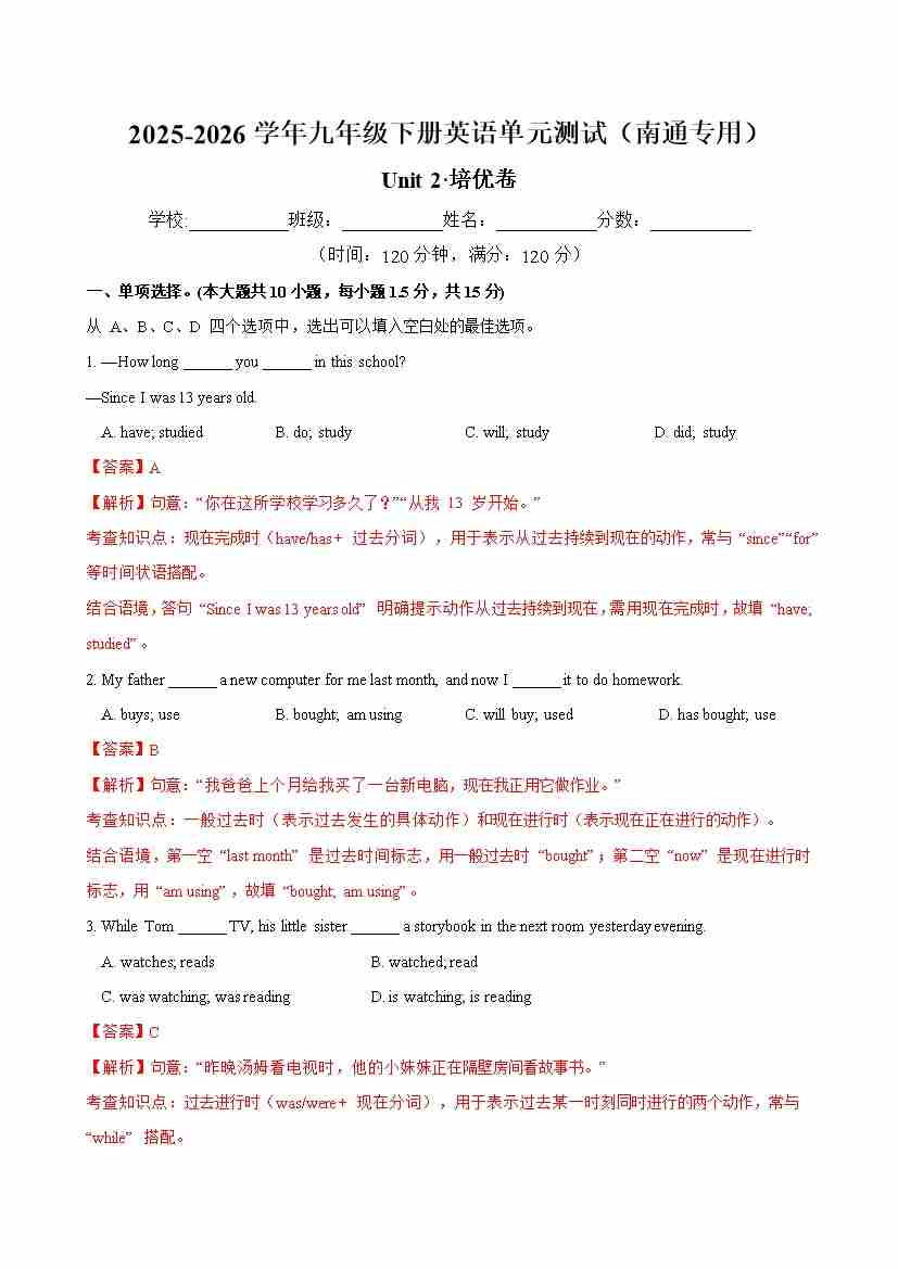 首页 > 全部 > 单元测试 > 九年级英语下册Unit 2 单元测试·南通专用(解析版)