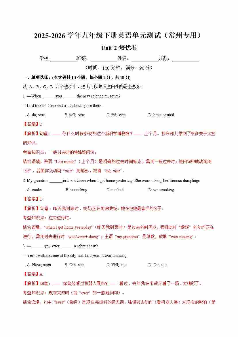 九年级英语下册Unit 2 单元测试·常州专用(解析版)
