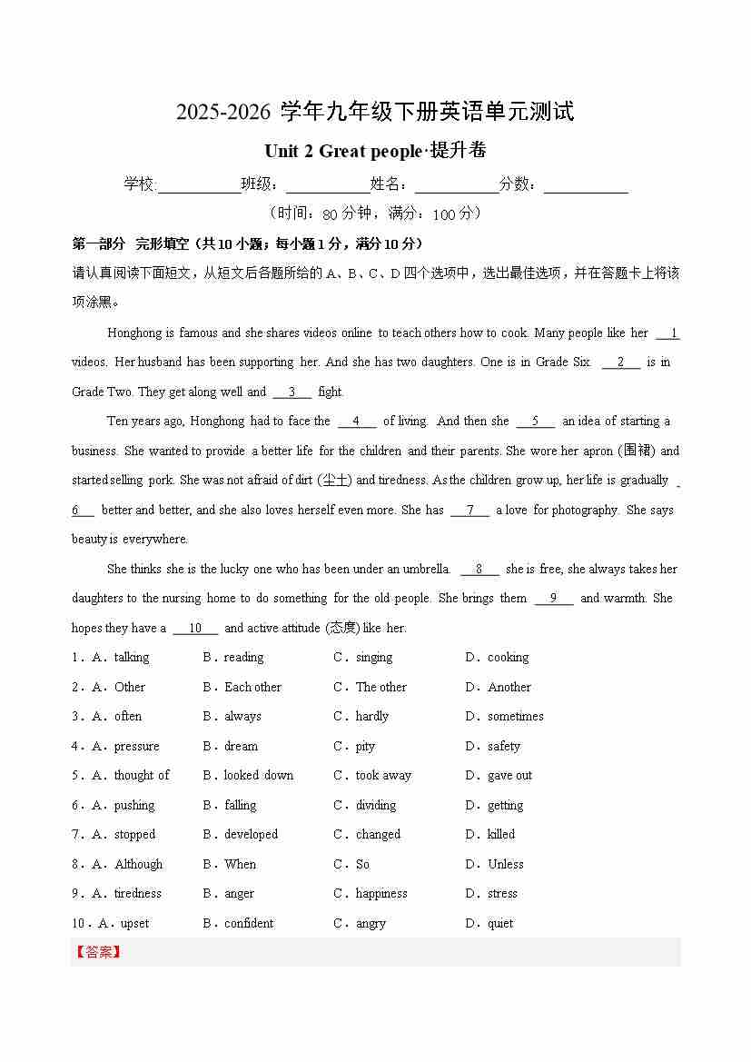 首页 > 全部 > 单元测试 > 九年级英语下册Unit 2 Great people 单元测试·提升卷(解析版)