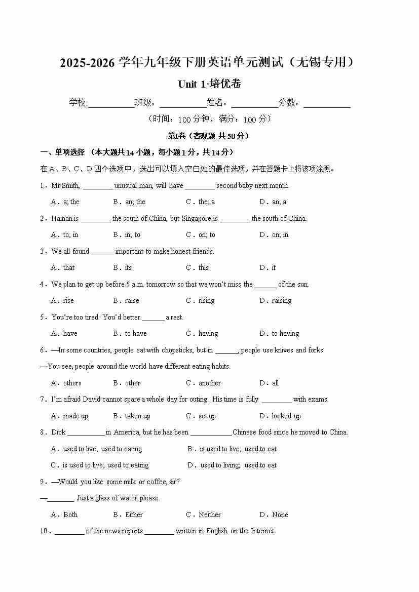 九年级英语下册Unit 1 单元测试·无锡专用(考试版A4)