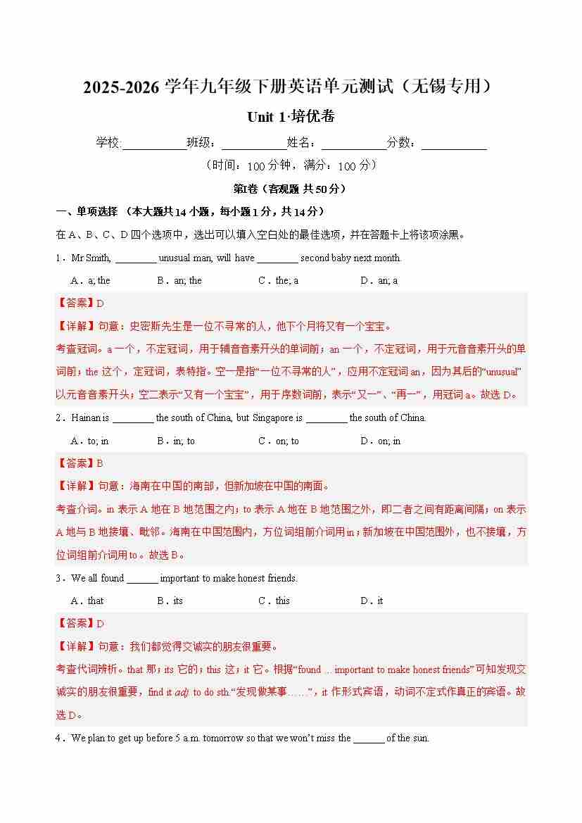 九年级英语下册Unit 1 单元测试·无锡专用(解析版)