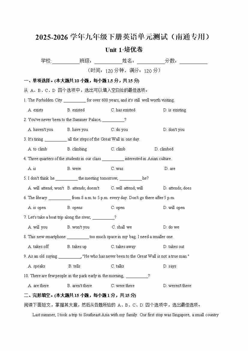 首页 > 全部 > 单元测试 > 九年级英语下册Unit 1 单元测试·南通专用(考试版A4)