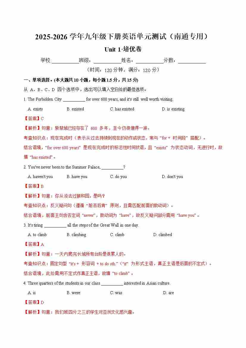 首页 > 全部 > 单元测试 > 九年级英语下册Unit 1 单元测试·南通专用(解析版)