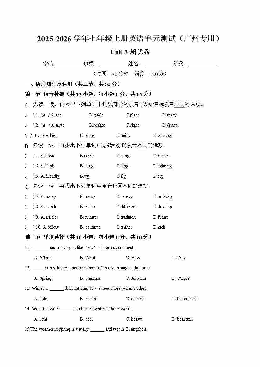 首页 > 全部 > 单元地区卷 > Unit 3 The seasons(单元测试·广州专用)(考试版A4)
