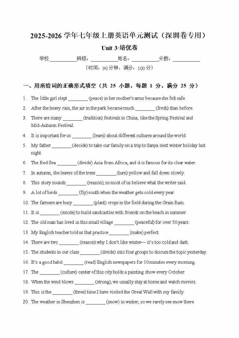 Unit 3 单元测试·深圳卷专用(教师版)