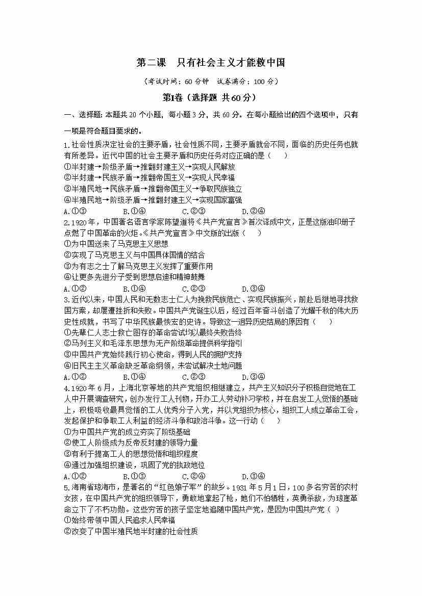 首页 > 全部 > 单元试卷 > 第二课 只有社会主义才能救中国(单元测试·提升卷)学生版