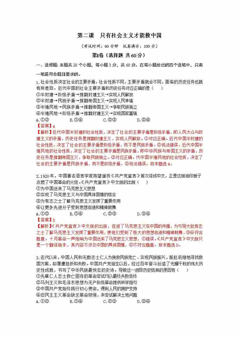 第二课 只有社会主义才能救中国(单元测试·提升卷)教师版