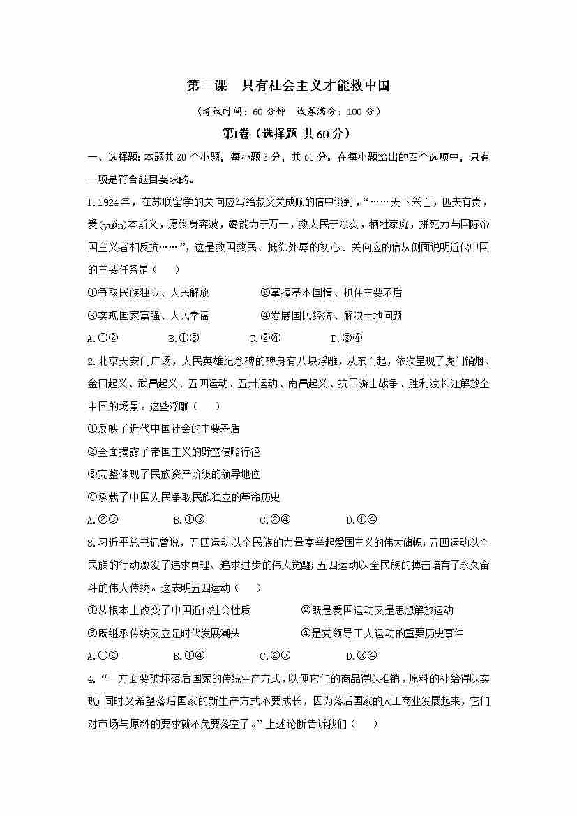 第二课 只有社会主义才能救中国(单元测试·基础卷)学生版