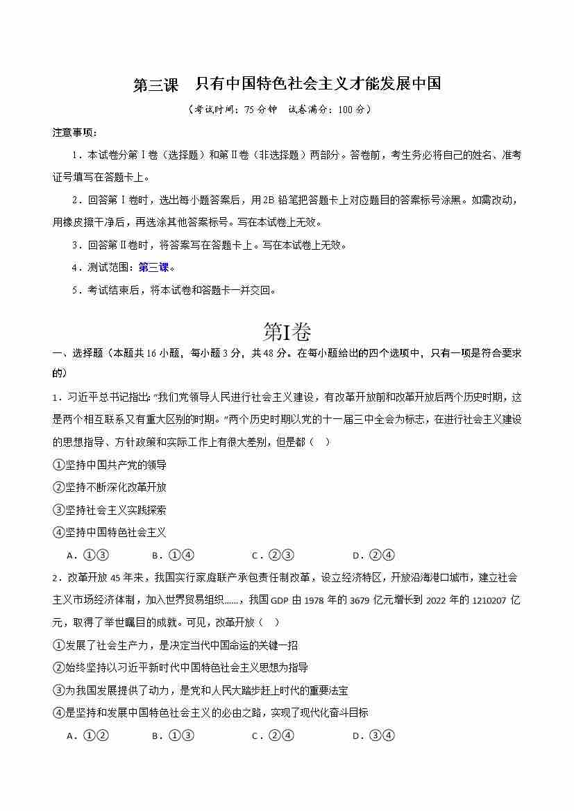 首页 > 全部 > 单元试卷 > 第三课 只有中国特色社会主义才能发展中国 (单元测试·提升卷) (学生版)