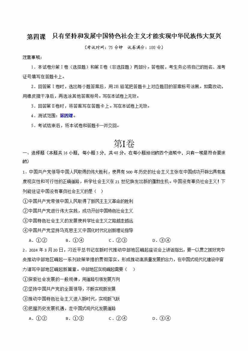 首页 > 全部 > 单元试卷 > 第四课 只有坚持和发展中国特色社会主义才能实现中华民族伟大复兴 (单元测试·基础卷) (学生版)