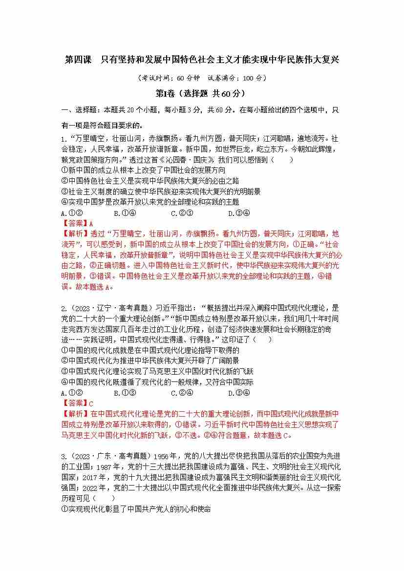 首页 > 全部 > 单元试卷 > 第四课 只有坚持和发展中国特色社会主义才能实现中华民族伟大复兴(单元测试·提升卷)教师版