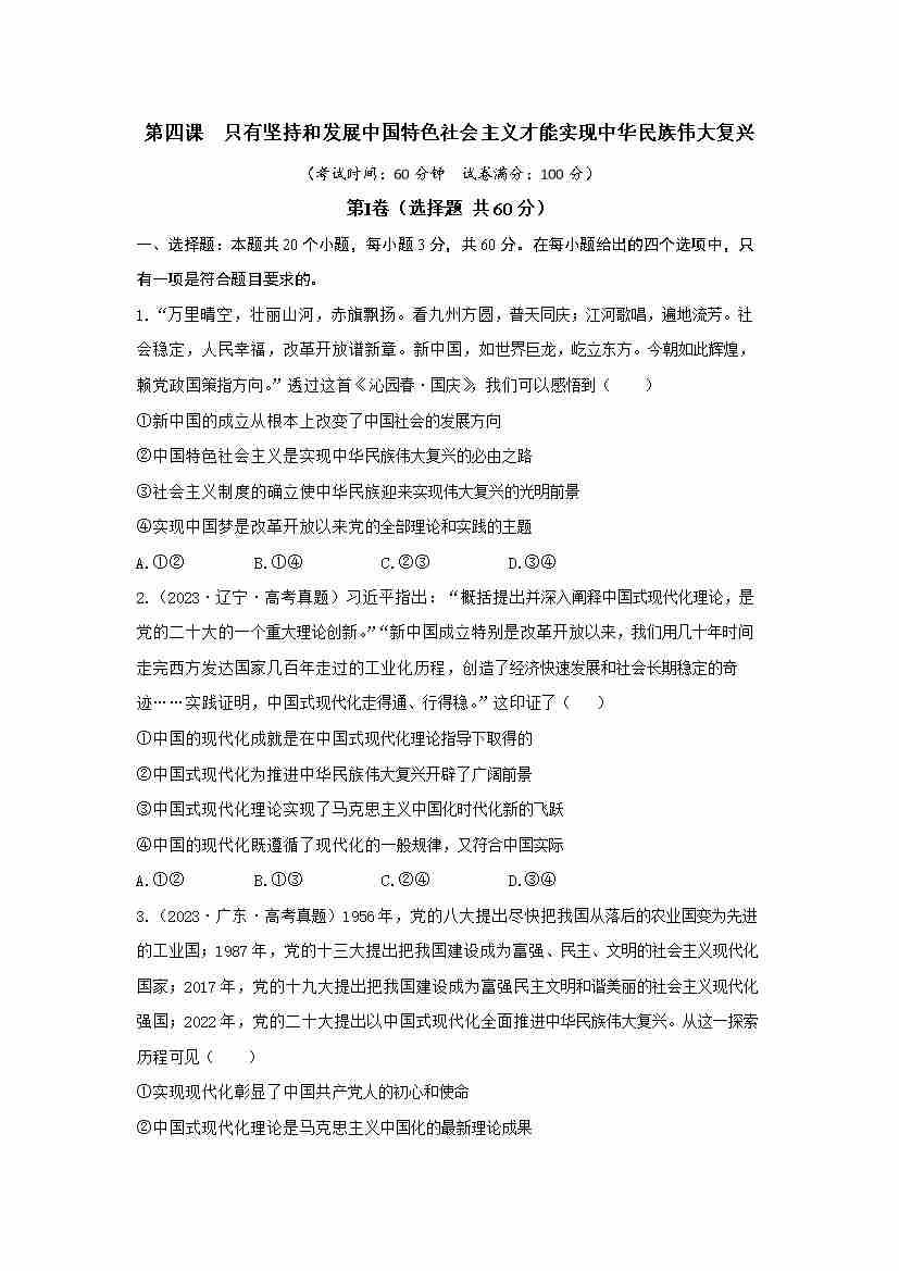 首页 > 全部 > 单元试卷 > 第四课 只有坚持和发展中国特色社会主义才能实现中华民族伟大复兴(单元测试·提升卷)学生版