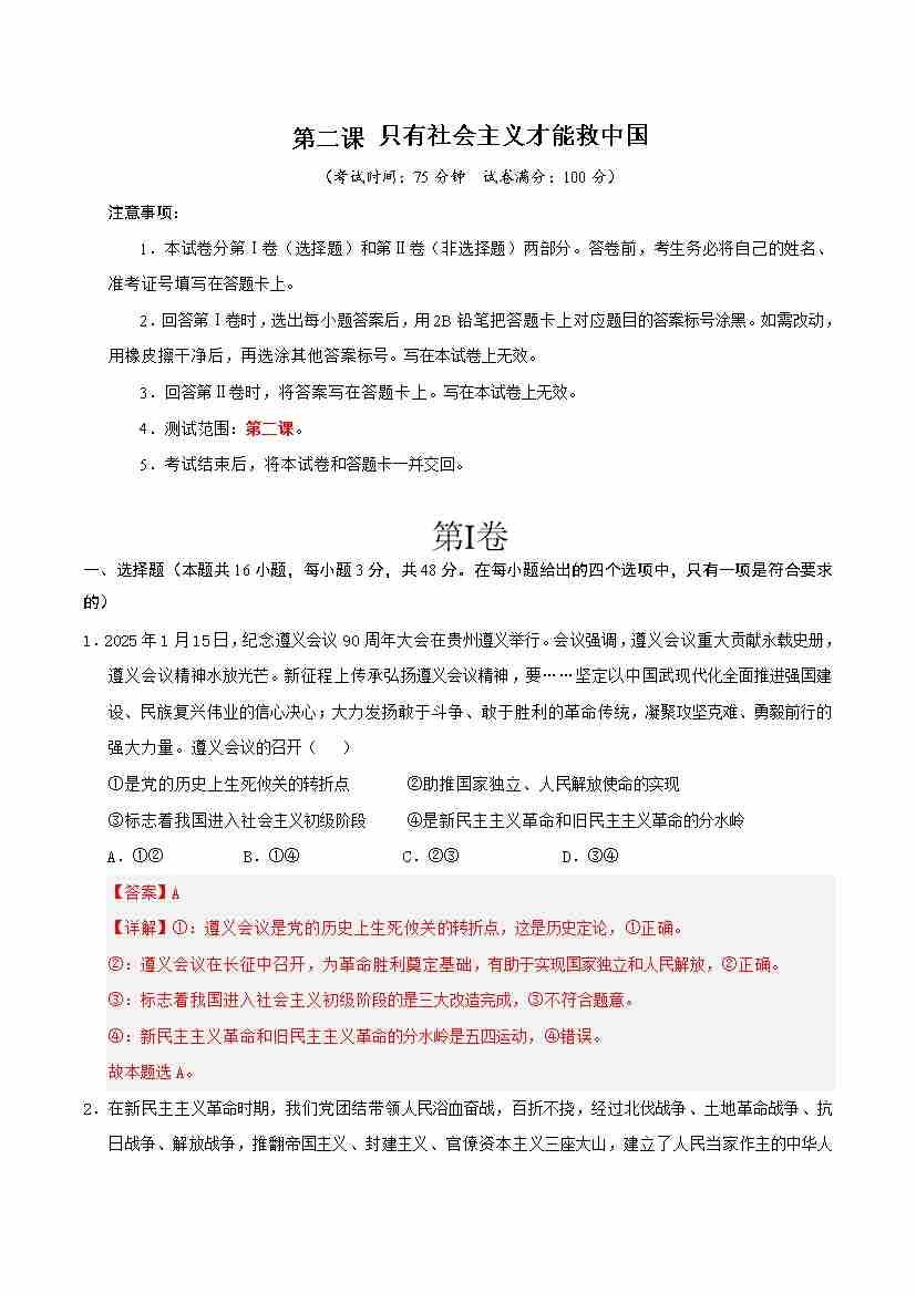 首页 > 全部 > 单元测试 > 第二课 只有社会主义才能救中国(单元测试·提升卷)(教师版)