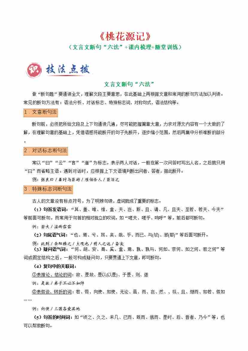 《桃花源记》(文言文断句“六法” 课内梳理 随堂训练))解析版